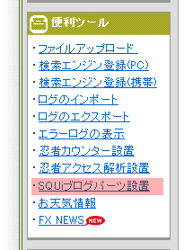 忍者ブログをお使いの皆様はもうお気づきと思いますが、忍者ブログの管理ページの「便利ツール」メニューの中に、「SQUiブログパーツ設置」というメニューがあります。